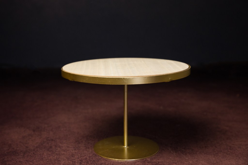 Présentoir pied doré plateau en bois clair. Hauteur 21 cm plateau 30cm
