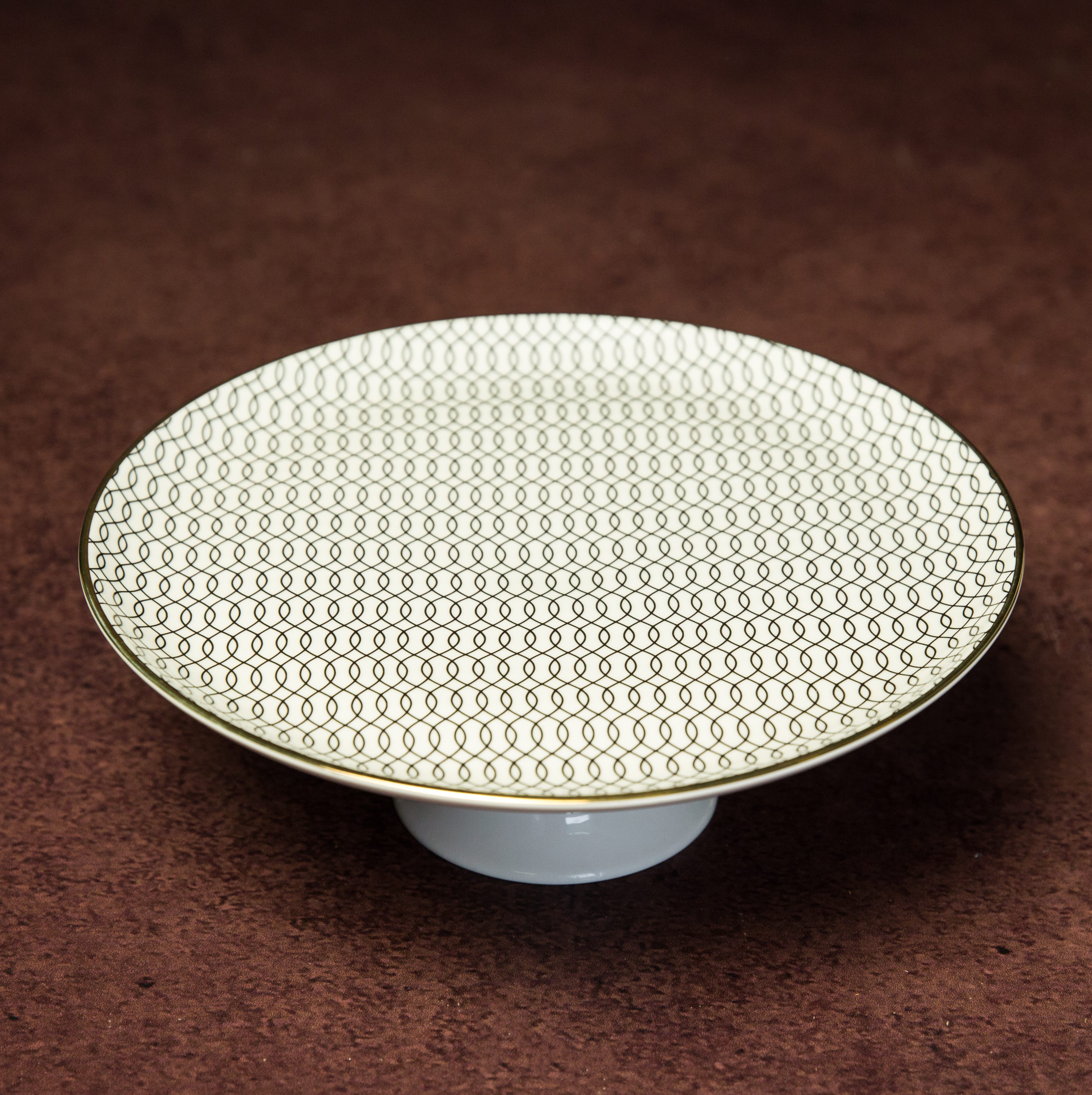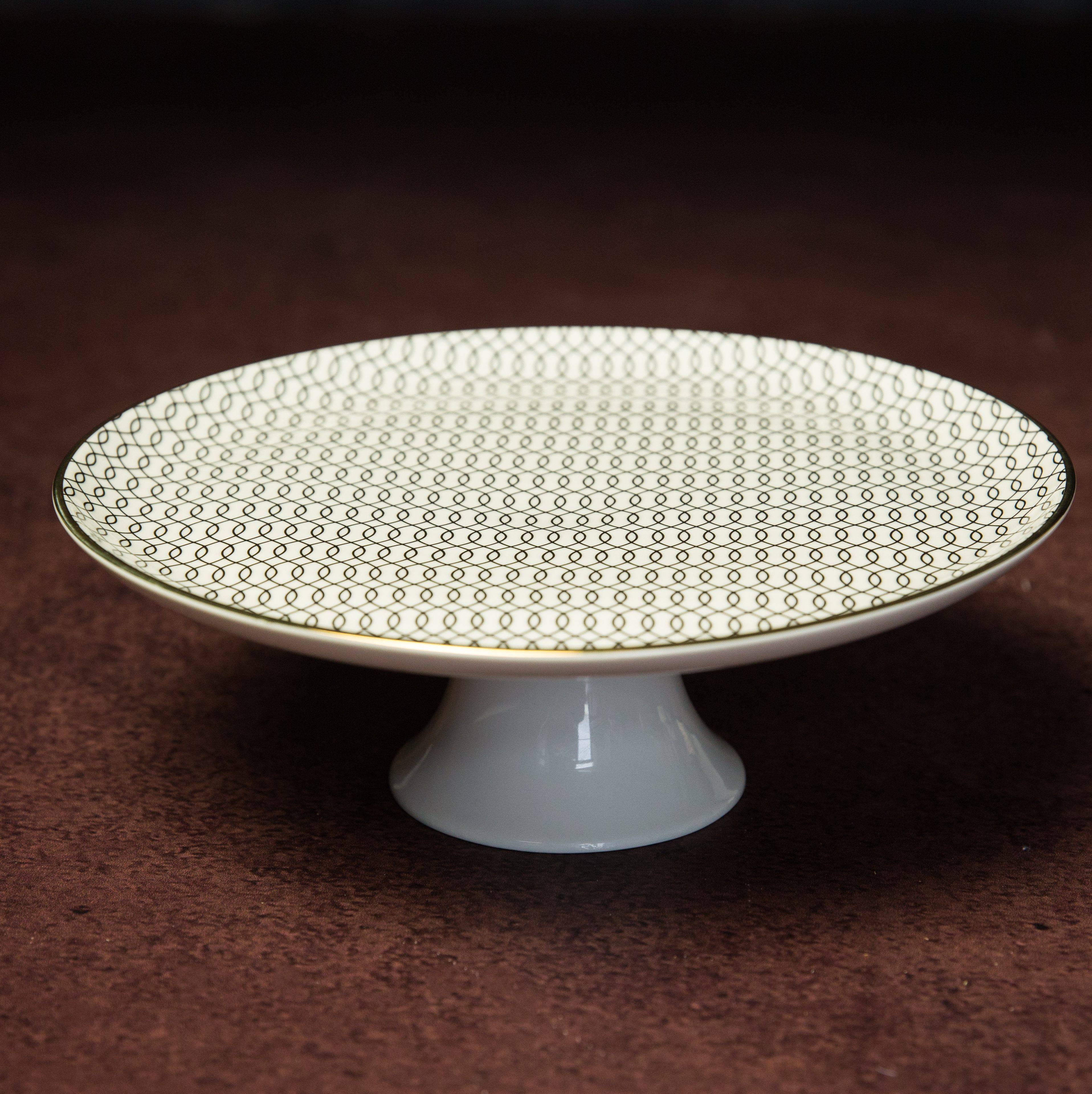 Présentoir en verre blanc et motif noir, liseret doré, dimension plateau 25cm, hauteur 8cm