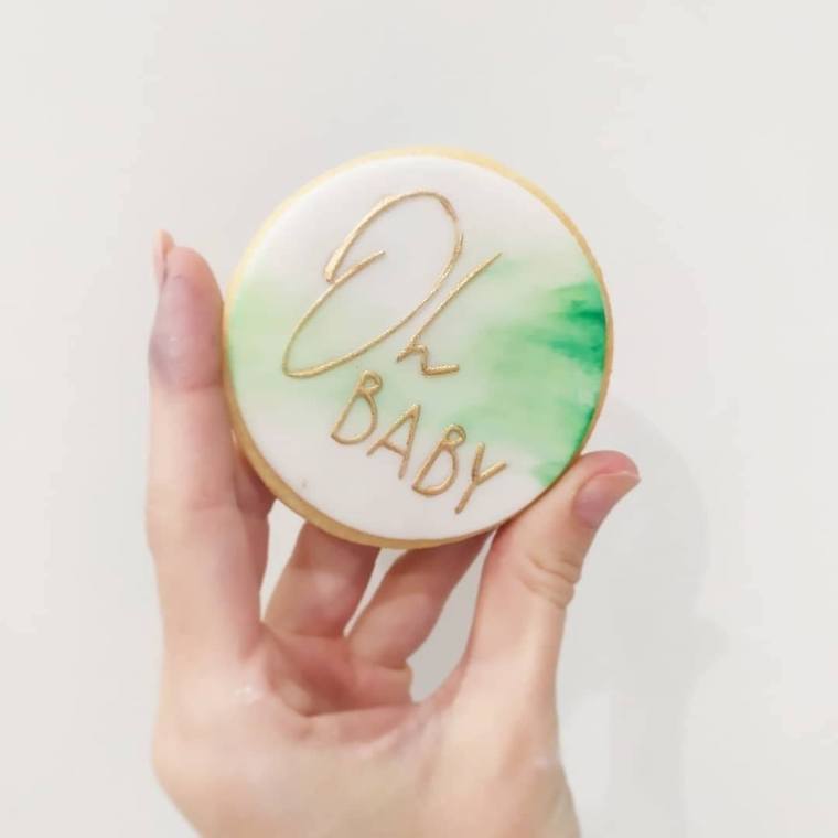 Cette boîte est composée de: 2 feutres alimentaires – Un tube de glaçage doré – Un sachet de perles – 4 biscuits recouverts et 2 biscuits brute. (Vanille)